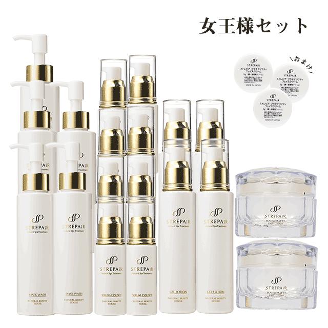 商品詳細 商品名 お姫様セット 内容量 ・マスクウォッシュ 110g×5本 ・セラムエッセンス 30ml×8本 ・ゲルローション 60ml×4本 ・プラチナリフティ 30g×2個 おまけ内容量 ・プラチナリフティ 5g×3個 特徴成分 【マスクウォッシュ】 ・天然樹液酵母エキス・海シルト・クダモノトケイソウ果皮エキス・ウコン根エキス・ツルレイシ果実エキス・ヨクイニンエキス・アロエベラ葉エキス・マンダリン果皮エキスなどの保湿成分配合 【セラムエッセンス】 ・天然樹液酵母エキス・ヒトオリゴペプチド-1・フラーレン・パルミチン酸アスコルピルリン酸3Na・リンゴ果実培養細胞エキス・加水分解コラーゲン・水溶性コラーゲン・ヒアルロン酸Na・ノバラエキスなどの若見え成分配合 【ゲルローション】 ・天然樹液酵母エキス・アーティチョーク葉エキス・ツルレイシ果実エキス・カッパフィカスアルバレジエキス・クダモノトケイソウ果皮エキス・ウコン根エキス・カンゾウ根エキス・アロエベラ葉エキス・マンダリン果皮エキスなどの保湿成分配合 【プラチナリフティ】 白金・ヒト脂肪細胞順化培養液エキス・エーデルワイスカルス培養エキス・プエラリアミリフィカ根エキス・ザクロエキス・加水分解アナツバメ巣エキス さらに詳しくはこちら♪